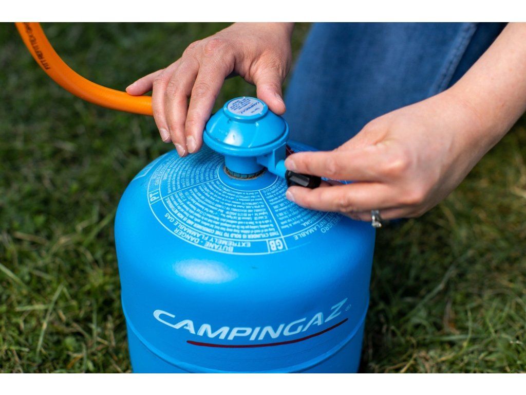 - Sady hadic a regulátorů Campingaz se prodávají samostatně. Obsahuje vestavěné bezpečnostní zařízení nazvané ‚Excess Flow Valve‘. Tím se automaticky zastaví průtok plynu, pokud by se hadice oddělila nebo odřízla od sporáku