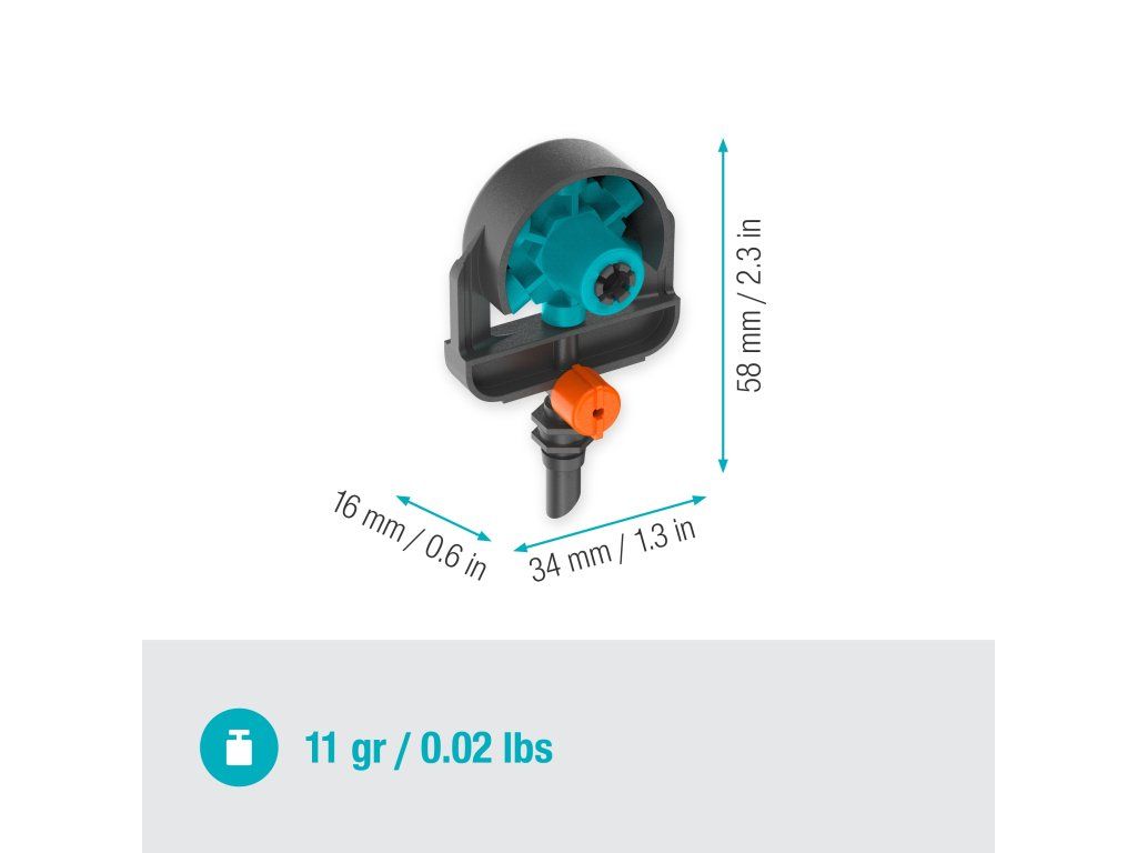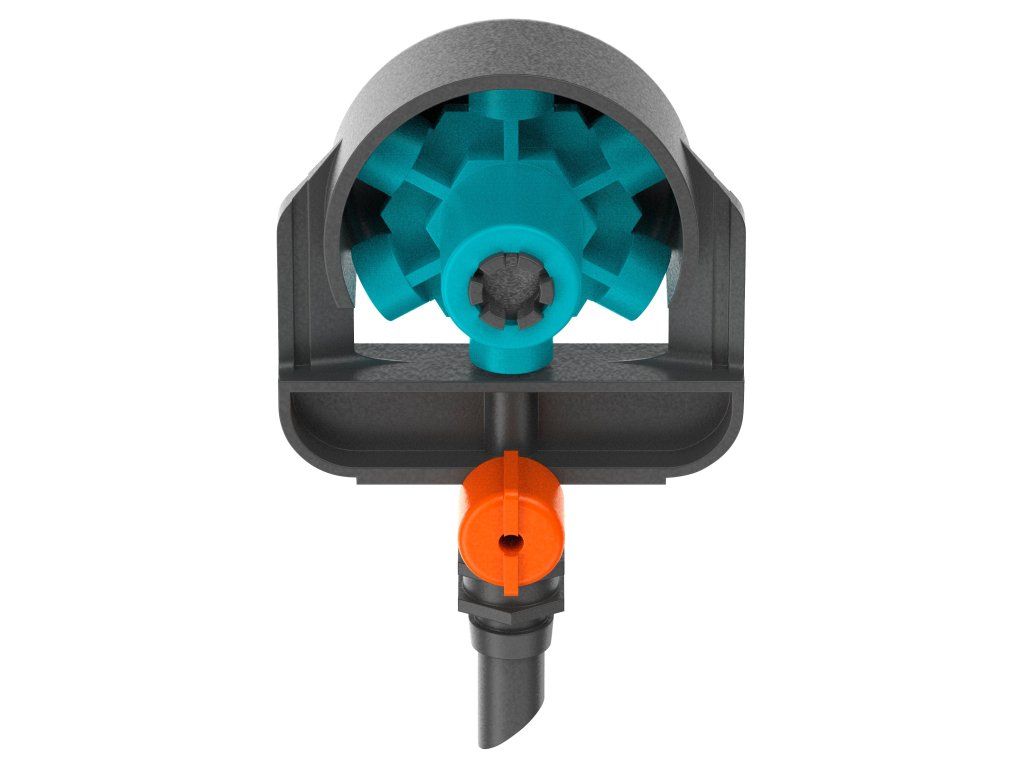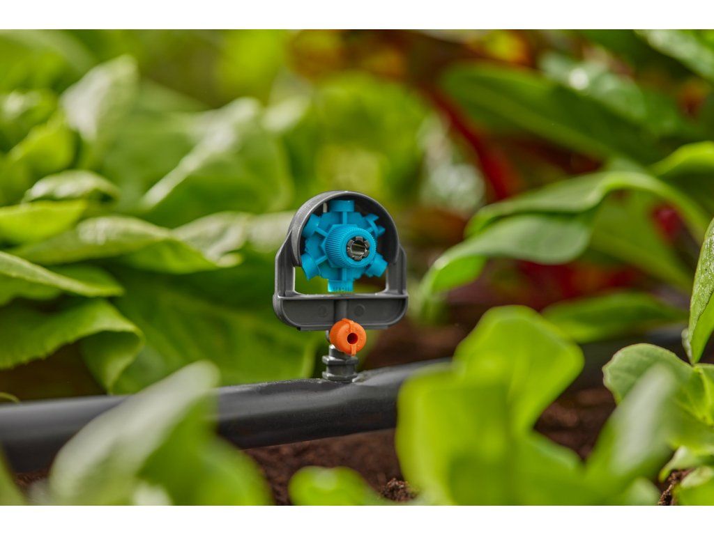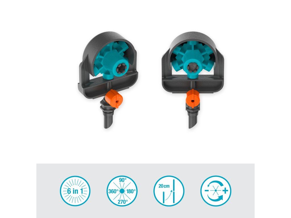 GARDENA rozprašovací tryska 6 v 1 vám poskytuje všechny možnosti flexibilního zavlažování zahrady. Spojuje v sobě přednosti několika rozprašovacích trysek a se svými šesti různými postřikovacími schématy se můžete individuálně přizpůsobit potřebám vašich zahradních rostlin. Tryska vydává jemnou mlhu a spolehlivě zavlažuje zeleninu, květiny nebo sazenice. Kromě nastavitelného zavlažovacího úhlu 90°, 180°, 270° nebo 360° můžete využít funkce mikro pruhovou trysku a koncovou mikro pruhovou trysku. Tyto umožňují zavlažovat dlouhé úzké zóny pouze v jednom nebo ve dvou směrech. Nakonec otočným knoflíkem určíte dosah postřiku. Instalace komponenty Micro-Drip-System na 13mm pokládací trubku je jednoduchá a snadno proveditelná proražením otvorů pomocí montážní pomůcky nebo použitím T-kusu pro rozprašovací trysky. S prodlužovací trubkou pro rozprašovací trysky (č. v. 13326-20) můžete kdykoliv zvýšit polohu rozprašovací trysky 6 v 1, abyste mohli pokračovat v postřiku zahradních rostlin shora i po prudkém růstu. Uzavírací ventil (č. v. 13207-20) zajišťuje regulaci průtoku vody a možnost uzavření jednotlivých větví pokládací trubky. Výsledkem je optimální zavlažování, které šetří vodu. Díky intuitivnímu designu, který od sebe jasně odlišuje všechny rozprašovací trysky GARDENA, můžete vidět obrazec postřiku přímo na stříkací hlavě. Micro-Drip-System. Péče o vaše rostliny a každou vzácnou kapku. vody Snadné a přesné zavlažování, které šetří vodu a čas.