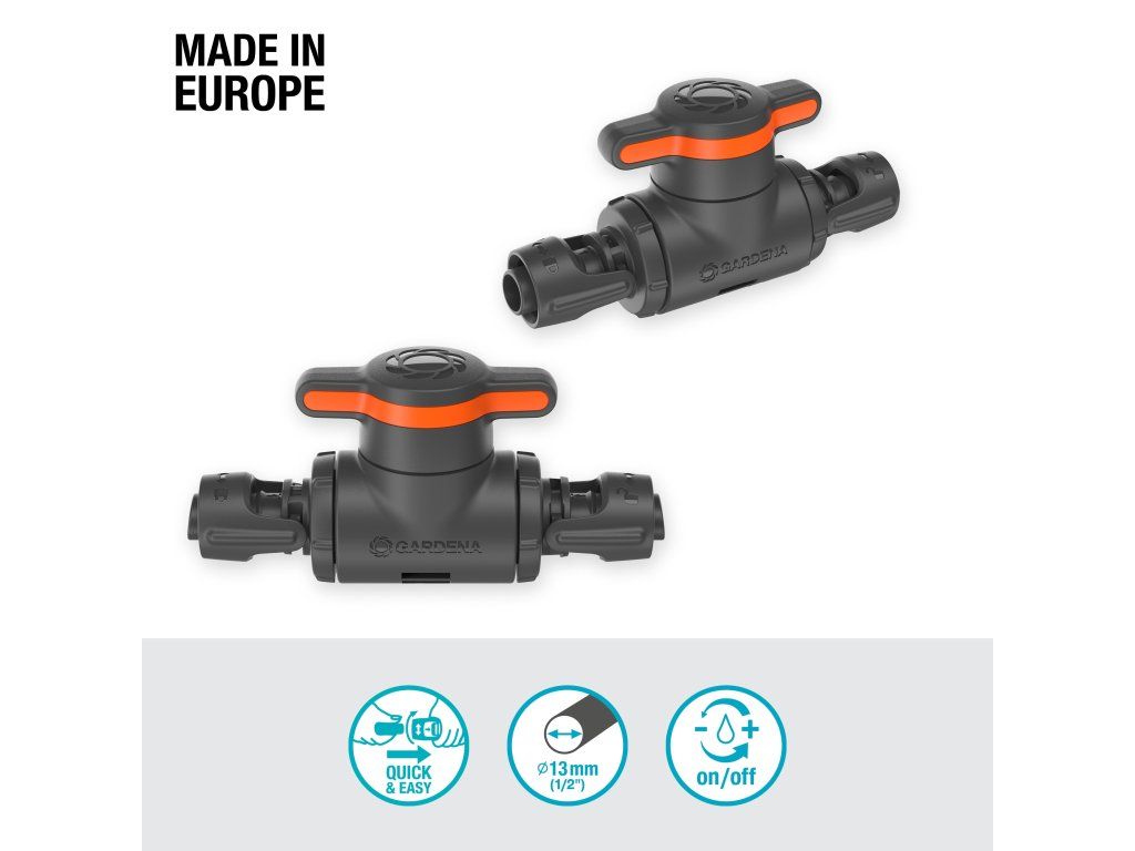 Uzavírací/regulační ventil 13 mm (1/2") od společnosti GARDENA umožňuje uzavřít nebo regulovat jednotlivé větve 13 mm spojovacího potrubí a kapacího zavlažovacího potrubí systému Micro-Drip. Ventil je velmi užitečný, pokud chcete zavlažovat rostliny s různou potřebou zavlažování nebo přerušit zavlažování řady rostlin po sklizni. Funkce hladké regulace vám umožňuje řídit průtok vody a individuálně se přizpůsobit vašim rostlinám pro optimální a zároveň úsporné zavlažování. S patentovaným připojením technologie, můžete svůj Micro-Drip-System na zahradě rozšířit rychle, snadno a flexibilně. Instalace je intuitivní a srozumitelná díky chytrým symbolům. Jasná zpětná vazba signalizuje, že ventil je v uzavřené poloze, což vám dává spolehlivý pocit při připojení. Pokud zkombinujete Micro-Drip-System se samostatně dostupným základním přístrojem 1000 (č. v. 13333-20) nebo základním přístrojem 2000 (č. v. 13310-20), je spolehlivý s konstantním tlakem vody. Systém je udržitelný díky své znovupoužitelnosti, protože díky technologii připojení Quick & Easy můžete všechny MDS-komponenty bez námahy propojit k sobě, flexibilně je rozšířit a snadno odpojit. Uzavírací/regulační ventil 13 mm (1/2") od společnosti GARDENA je vyroben v Evropě. Micro-Drip-System. Péče o vaše rostliny a každou vzácnou kapku vody. Snadné a přesné zavlažování, které šetří vodu a čas.