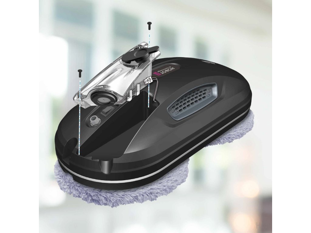 V případě, že je třeba vyměnit zanesenou ultrazvukovou trysku, jednoduše vyměníte celý modul zásobníku na vodu uvolněním dvou šroubků a přístroj bude opět fungovat jako nový. Velikost obsahu zásobníku je 24 ml, což vystačí na čištění plochy o rozměru 24 m2. Jako náplň používejte pouze destilovanou vodu nebo originální čistící přípravek značky HOBOT.