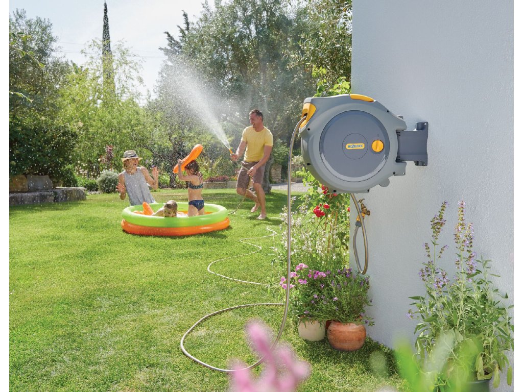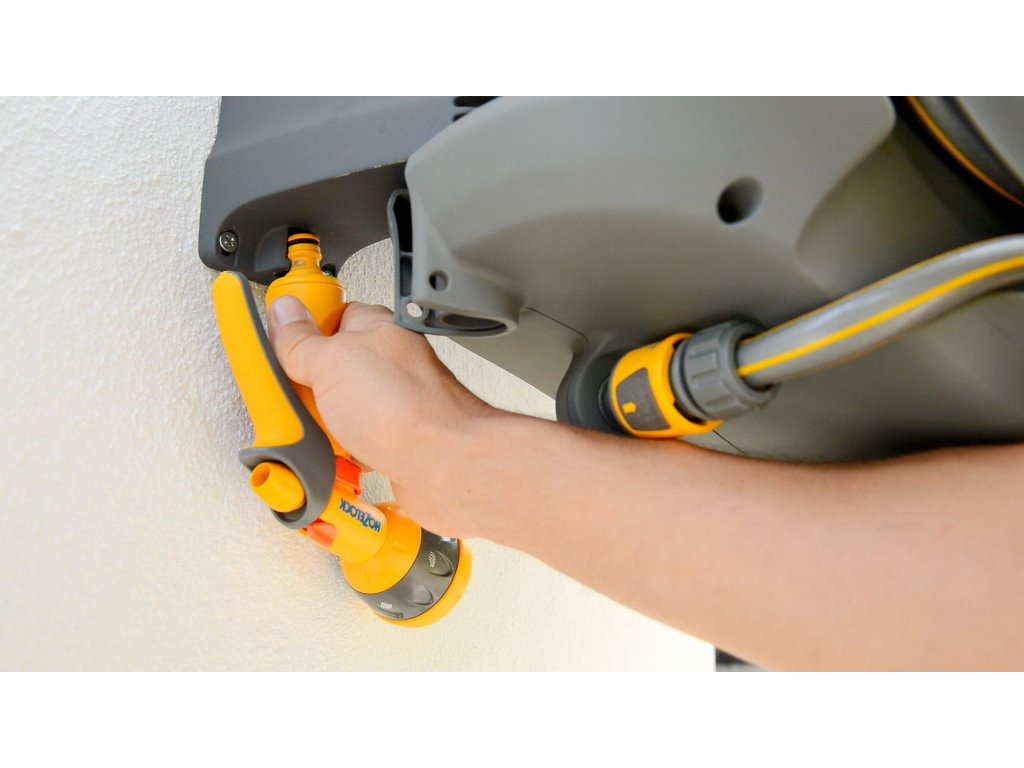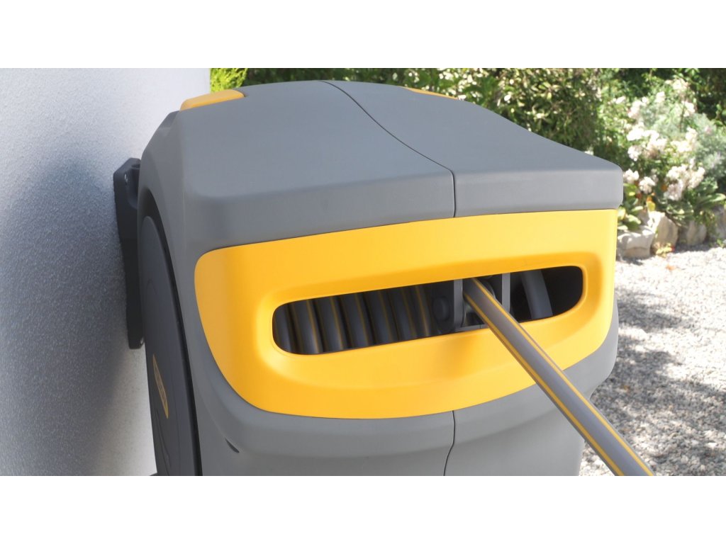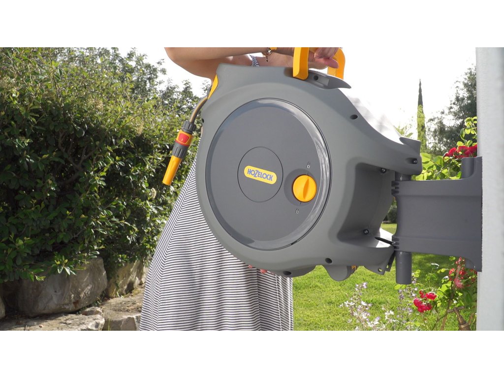 Automatický naviják namontovaný na robustním nástěnném držáku, který se otáčí o 180 stupňů, vám umožní bez námahy dosáhnout do každé části vaší zahrady. Po použití se složí naplocho ke zdi pro kompaktní skladování.