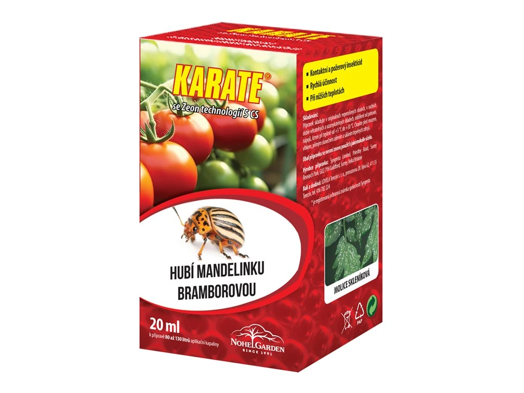 Insekticid ve formě suspenze kapsulí určený k přípravě aplikační kapaliny. Slouží k ochraně rajčat proti savým a žravým škůdcům. Působí kontaktně i požerově a zajišťuje rychlý nástup účinku s vysokou spolehlivostí i při nižších teplotách. Hubí mandelinku bramborovou a molici skleníkovou na rajčeti. Formulace využívá Zeon technologii mikrokapsulace, při níž je účinná látka uzavřena do polymerních kapsulí, které se po aplikaci postupně uvolňují, zvyšují stabilitu účinné látky na povrchu rostlin a prodlužují účinnost zásahu. Balení 20 ml postačuje k přípravě přibližně 80 až 130 l aplikační kapaliny dle plodiny a intenzity napadení. Účinná látka: lambda-cyhalothrin 50 g/l. Objem balení: 20 ml.