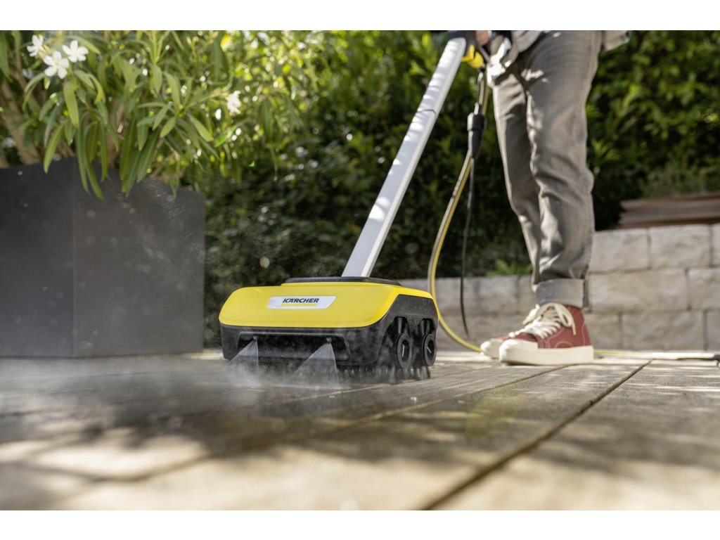 Elektricky poháněný čistič teras PCL 6 lze použít k mimořádně snadnému, rovnoměrnému, rychlému a důkladnému odstranění odolných nečistot. Zařízení stačí připojit k zahradní hadici - a můžete začít čistit. Díky kombinaci čtyř rotujících válečkových kartáčů a nastavitelného přívodu vody lze nečistoty rychle a spolehlivě smáčet a zároveň je sbírat a odnášet. Terasa je důkladně vyčištěna téměř během okamžiku, a to pouze za použití minimálního množství vody, které je potřeba. Šířka a poloha válců jsou navrženy tak, aby bylo možné v jednom kroku vyčistit dvě řady až po okraj, což rovněž šetří čas. Díky vyměnitelným kartáčům válečků lze snadno čistit nejen dřevěné a WPC podlahové krytiny, ale také hladké a jemně pórovité kamenné dlaždice a desky, a dosáhnout tak dokonalých výsledků.