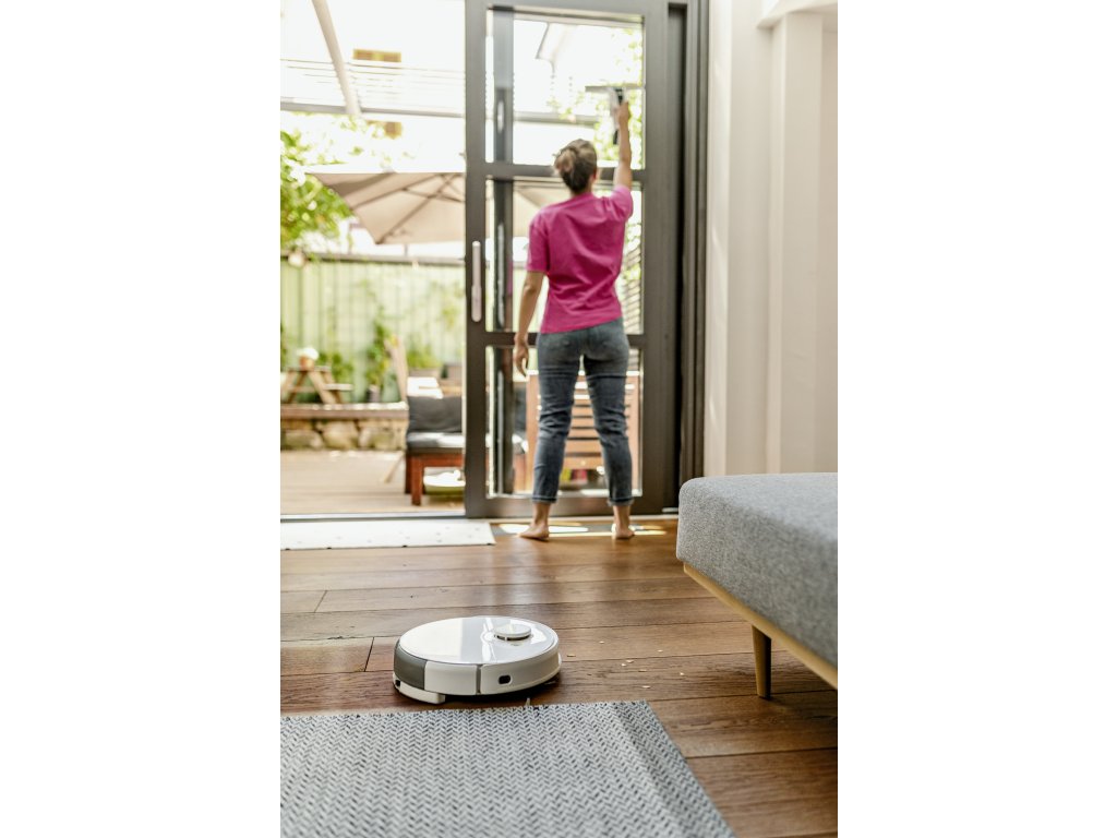 RCV 5 Comfort kombinuje umělou inteligenci s dvojitým laserovým systémem a kamerou, aby rozpoznal překážky, jako jsou kabely nebo boty, a bezpečně je objel. Po spuštění začne robot samostatně vysávat: suché nečistoty spolehlivě dopraví do odpadní nádoby rotující kartáč, boční kartáče a výkonný ventilátor. Ultrazvukový senzor koberců detekuje koberce a aktivuje výkonný režim vysávání Auto Boost. Volitelně může být RCV 5 vybaven stírací jednotkou, takže dokáže také vytírat podlahy. V režimu vytírání se robot automaticky vyhýbá kobercům. Pomocí detekce prostředí LiDAR vytváří RCV 5 mapu místnosti, kterou lze přizpůsobit v aplikaci. Můžete tak definovat oblasti, které se mají vždy pouze vysávat nebo pouze vytírat. Robot se aktivuje pomocí aplikace, přednastaveného plánu nebo stisknutím tlačítka. V aplikaci lze sledovat stav úklidu. V případě problémů vydává RCV 5 upozornění prostřednictvím hlasového výstupu. Po dokončení svého úkolu nebo v případě potřeby mezi tím se automaticky vrátí do chytré nabíjecí a samočinné stanice, kde automaticky vyprázdní nádobu na prach a dobije baterii.