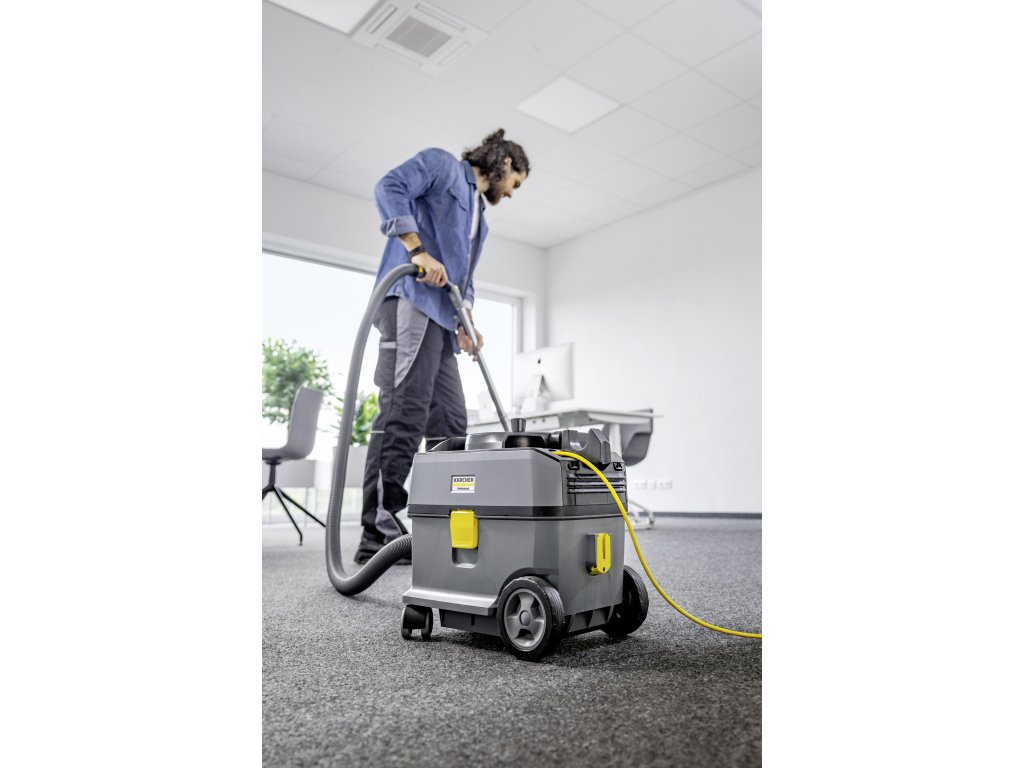 Suchý vysavač T 10/1 se skládá ze 45 procent z recyklovaného materiálu*, který šetří zdroje a šetří energii během výrobního procesu. Zaujme prvotřídním sacím výkonem, udržitelností, robustností a vynikajícím poměrem ceny a výkonu. Navzdory vysokému sacímu výkonu pracuje T 10/1 s hlučností pouhých 52 dB(A), a proto je mimořádně tichý, takže jej lze bez problémů používat pro denní čištění a v oblastech citlivých na hluk. Kompaktní stroj nabízí pohodlnou, skládací rukojeť pro ergonomickou přepravu. T 10/1 je odolný proti převrácení a manévrovatelný. Objem vysavače je 10 litrů. Jeho odolnost a robustnost jsou patrné z prvků, jako je podvozek, kryt, nárazník a velká kola. Štěrbinovou hubici, která je součástí dodávky, lze uložit do integrovaného úložného prostoru pro příslušenství na T 10/1, a proto je vždy po ruce. Volitelně lze zakoupit vysoce účinný filtr HEPA 14.