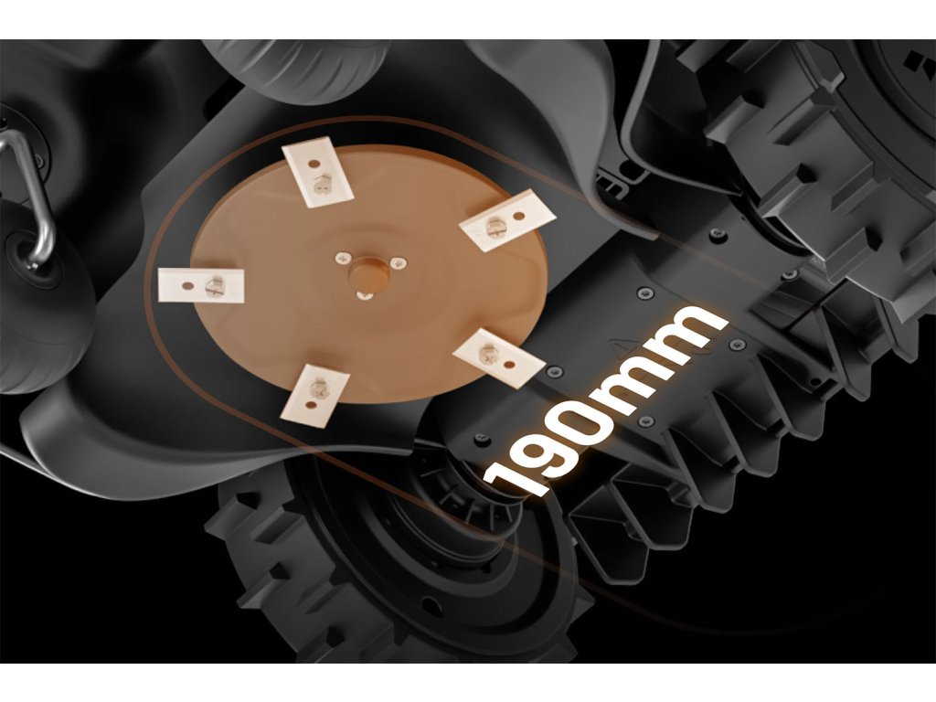Jeden žací kotouč s 5ti žacími noži má záběr sečení 190 mm. Robotická sekačka YUKA mini 2 800 zajistí efektivní sečení trávníku a po dokončení sečení robotická sekačka YUKA mini 2 dodatečně projede podél hranic a začistí okraje (ride-on-edge), aby byl trávník precizně dosečen a začištěn, v uživatelem definované vzdálenosti.