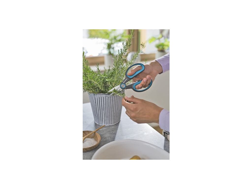 Se třemi otvory různých velikostí pod noži mají nůžky užitečnou funkci odstranění listů u dřevitých bylin, jako je např. rozmarýn. Jednoduše vložíte stonek, protáhněte ho otvorem a listy se odstraní jedním plynulým pohybem; lze je poté použít přímo k vaření nebo sušení.