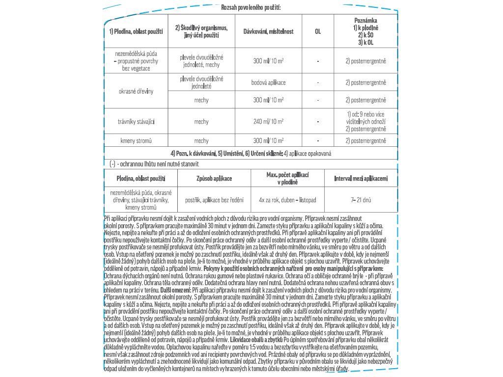 Herbicidní přípravek ve formě kapaliny k aplikaci bez ředění určený k likvidaci nežádoucích plevelů a mechu pod okrasnými keři a stromy za předpokladu, že jsou již hlubokokořenící s dřevitou kůrou; při přípravě záhonu na výsadbu a výsev okrasných rostlin, ovoce a zeleniny; kolem skleníku, zimních zahrad a podél plotu; pro odplevelení před jarním nebo podzimním rytím.