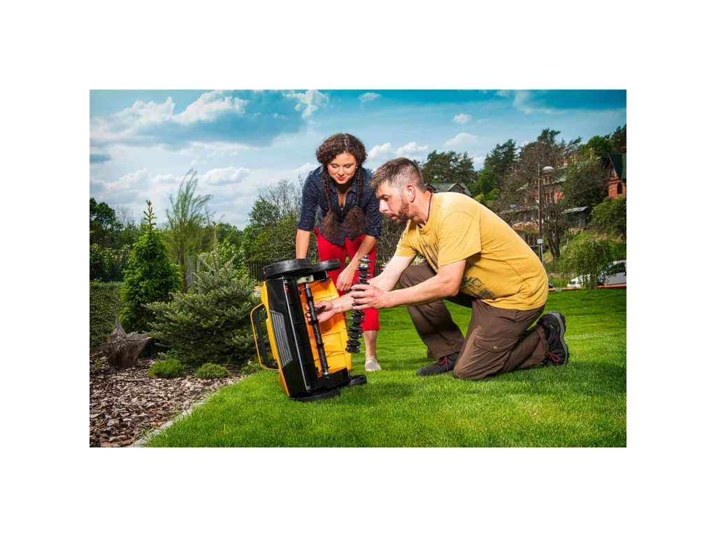 užitečný pomocník pro ty, kdo chtějí zdravý, hustý a krásně zelený trávník výkonný motor 1600 W si poradí i s hustou a dlouho neudržovanou trávou záběr 38 cm je vhodný na pozemky s rozlohou do cca 1000 m2 velká přední kola pro snadný pojezd i po nerovném terénu snadné přestavění hloubky záběru jednou pákou velký sběrací koš ve standardu má široký výstupní otvor a madlo pro snadné vysypávání široký výhozový tunel stroj je vybaven dvěma snadno vyměnitelnými válci – válcem s drátky na vyčesání staré trávy, plevelů, mechů apod. a válcem s noži, který navíc profrézuje půdu ještě více do hloubky uložení válců v ložiskách snadná výměna válců povolením jednoho šroubu nástroj na povolení válce má integrovaný držák přímo na stroji, takže je vždy po ruce velké madlo pro snadné přenášení složitelná řídítka pro snadný transport bezpečnostní spínač a držák el. kabelu